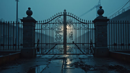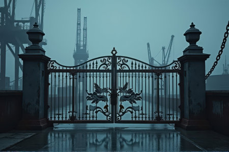 That the image is generated using AI. Ornate iron gate in foggy industrial harbor setting at dawn.