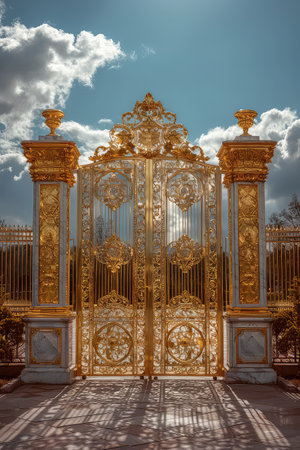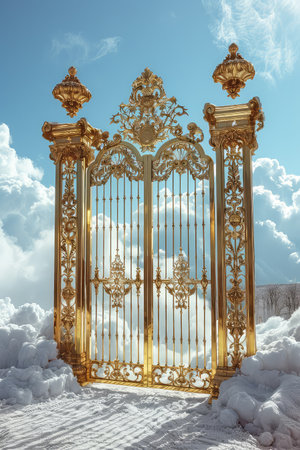 Closed golden gates of Paradise against the background of white clouds. Closed entrance to Paradise for sinners. The closed gates of Paradise shimmer against the clouds, a symbol of hope and regret.