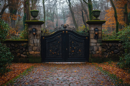 Wrought iron gate protecting a secret garden on a foggy autumn day, creating a mysterious and evocative atmosphere