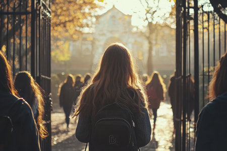 A group of students walking through a gate on a sunny day. Back view of a girl with a backpack.