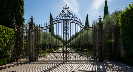 Discover a captivating iron gate leading to a serene garden inviting exploration and tranquility.