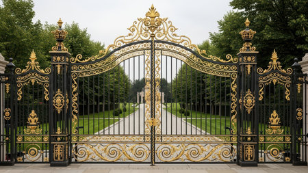 A magnificent, ornate wrought iron gate stands open, revealing a long paved driveway lined with manicured trees leading to a luxury estate. The intricate metalwork and grand scale of the entrance evoke a sense of wealth, security, and architectural elegance.