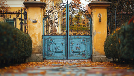Old blue metal gate with ornamented details, leading to a mysterious house in autumn