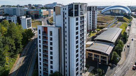 An aerial view captures a modern cityscape with several tall apartment buildings, a large arched glass structure, and other urban buildings in Newcastle upon Tyne, UK.