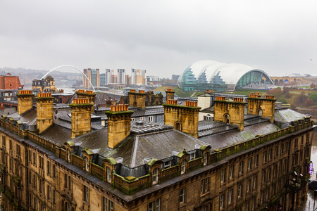 Newcastle city skyline with Quayside viewed from Tyne Bridge on a cloudy day