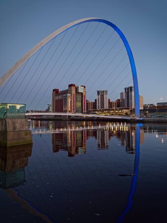 Twilight at Gateshead Millennium Bridge, at the Quayside in Newcastle, on the banks of the River Tyne, and Newcastle upon Tyne skyline beyond