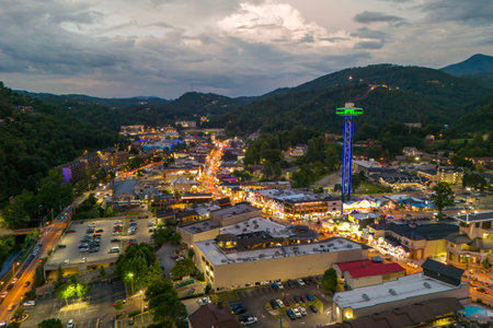 Gatlinburg, Tennessee at night. Popular resort town surrounded by Appalachian mountain hills, featuring the main Parkway lined with shops, restaurants, and tourist attractions.