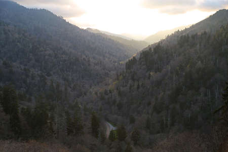 Great Smoky Mountain Sunset Landscape Panorama. Sunset horizon over the Great Smoky Mountains from Morton overlook on the Newfound Gap Road in Gatlinburg, Tennessee.