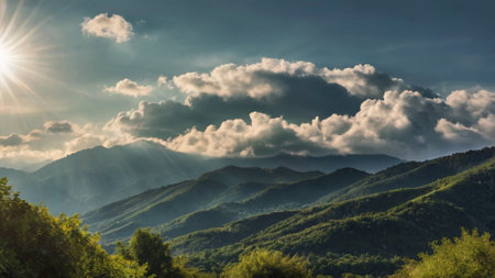 Captivating mountain landscape under an expansive sky, showcasing lush greenery in the foreground and soft clouds that evoke a sense of tranquility and peace.