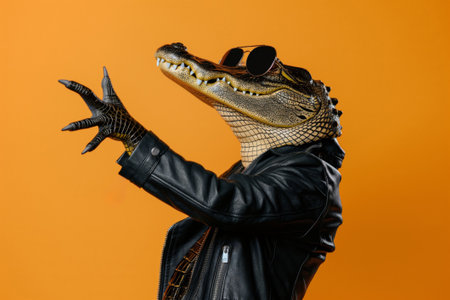 Trendy crocodile clad in a black leather jacket and aviator sunglasses poses against an orange backdrop, exuding cool charisma