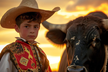 Portrait of a young boy in traditional cowboy attire with his bull during a vibrant sunset