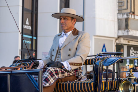 SAO BRAS DE ALPORTE, PORTUGAL - 4th MAY 2024: Period representation event of Carriage coupling traditional event with beautiful carriages with horses and person dressed for the occasion.