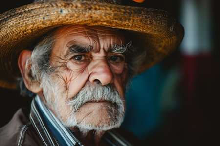 An elderly man with weathered features and a straw hat gazes thoughtfully into the distance, his face telling a story of life's experiences.