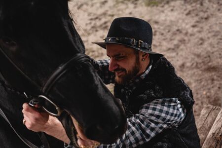 handsome groom in a hat stroking a horse. man with a horse