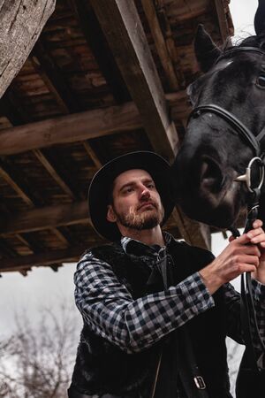 Portrait of a guy in a hat with a black horse.