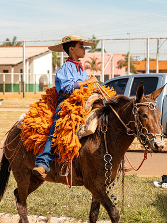 Apore, Goias, Brazil - 05 07 2023: Horseback riding event open to the public on public roads in the Brazilian city of Apore