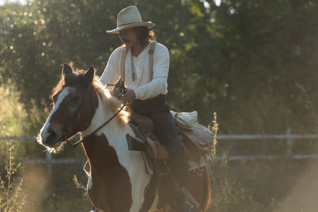 Caucasian male horseback rider at sunset on savanna landscape