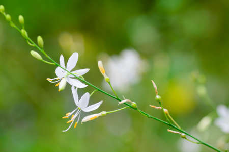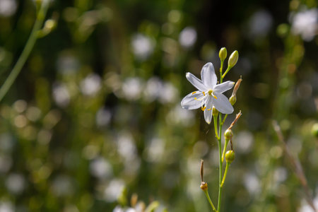 Fragile white and yellow flowers of Anthericum ramosum, star-shaped, growing in a meadow in the wild, blurred green background, warm colors, bright and sunny summer day.
