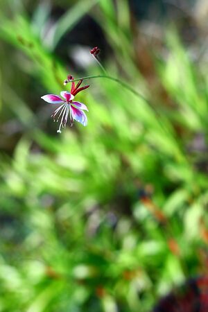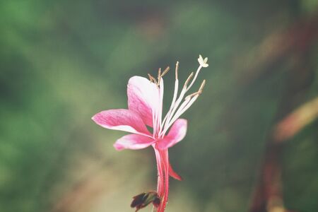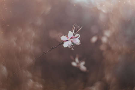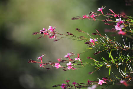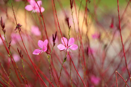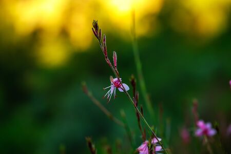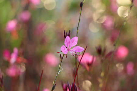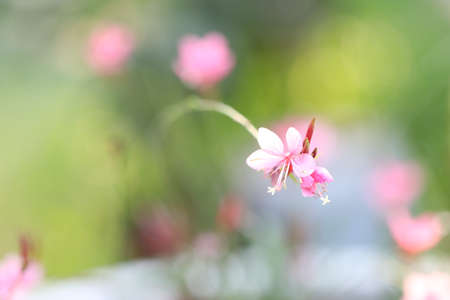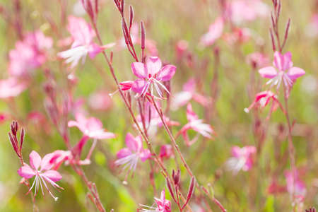 Small flowers of light pink color ( Siskiyou Pink Gaura) in the sunlight at summer morning. Selective focus.
