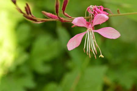 Gaura pink flowers blooming, garden design, spring gaur lindheimeri or whirling butterflies in Mediterranean garden, sun, dreamy inflorescence in a garden, closeup