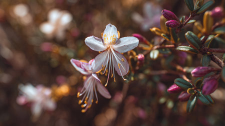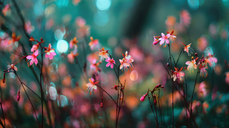 Explore the enchanting beauty of delicate pink flowers blossoming in a soft focus background, illuminated by ethereal light, creating a serene garden atmosphere.