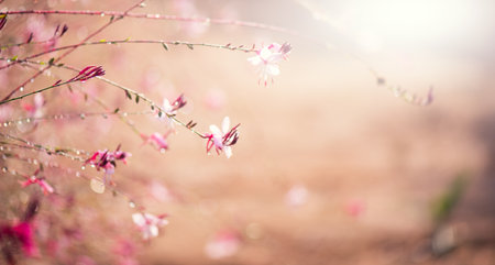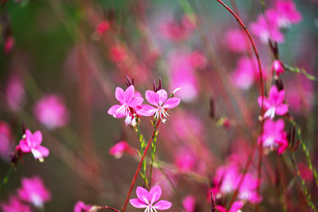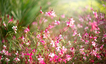 Gaura pink flowers blooming, garden design, spring gaur lindheimeri or whirling butterflies in Mediterranean garden, sun, dreamy inflorescence in a romantic country cottage garden,