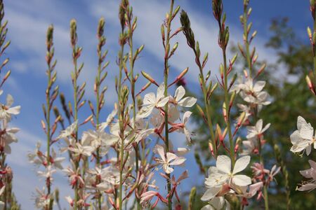 Tender white Gaura lindheimeri flowers blossoming on flower bed on sunny summer day. Beauty in nature.