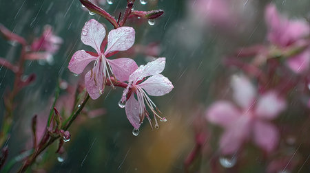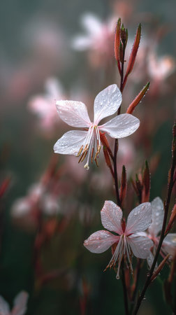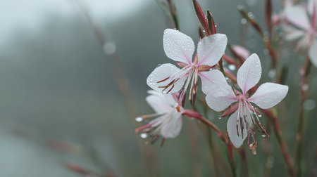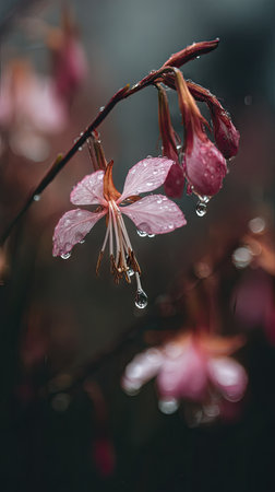 Soft rain falling gently on Gaura, with water droplets forming and slowly dripping. The background is softly blurred with a natural, moody atmosphere.