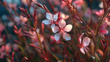 A cluster of pink gaura flowers flourishes in a lush garden, their slender petals swaying gently in a light breeze under the warm afternoon sun, creating a picturesque view of natures beauty.