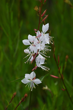 White Gaura or Oenothera lindheimeri blooming at flowerbed flowers and buds close-up, selective focus, shallow DOF.