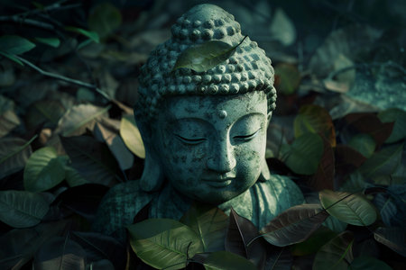 Embrace tranquility as the suns rays highlight the serene Buddha face, a symbol of deep meditation and inner peace.