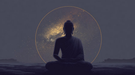 Deeply shadowed, contemplative figure sits in a traditional cross-legged meditation posture, centered beneath a luminous golden circle that frames a depiction of a brilliant, starry galaxy or celestial expanse, set against a muted, dark twilight or night sky above a shadowy horizon.