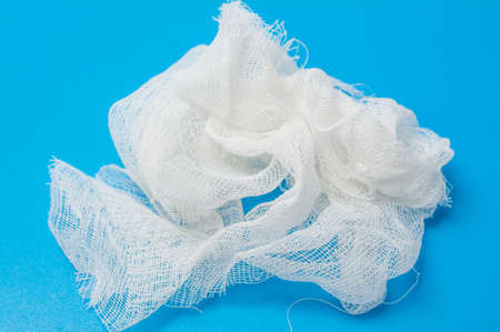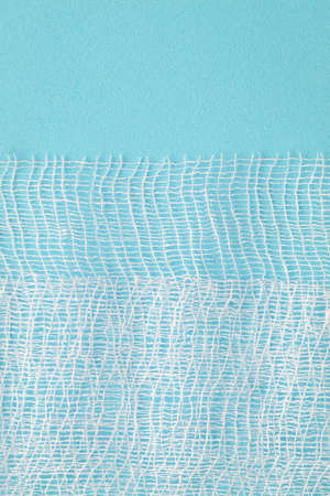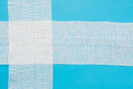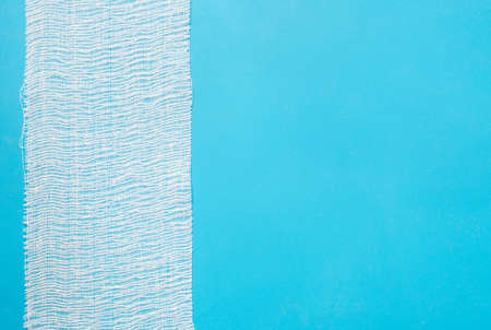 Gauze bandage on a blue background with blank space for text. Manufacture of protection surgical mask with your own hands, mask material. Respiratory protection. Banner for web site