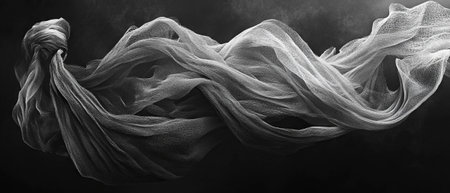 This captivating image features an ethereal flow of soft fabric, creating an abstract artistic composition against a black background. Ideal for design projects.