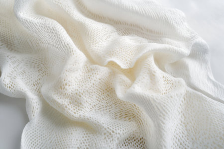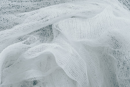 White, soft fabric with natural wrinkles creates a textured background. The textile shows a delicate, airy mesh weave