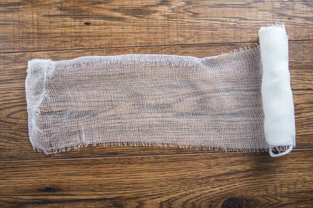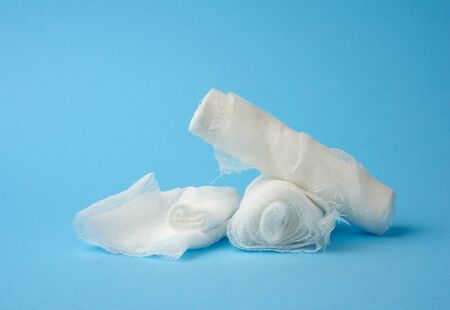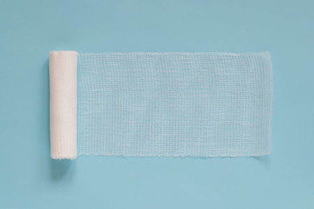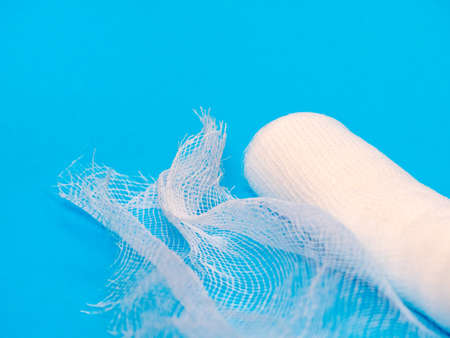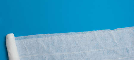 Unwound roll of white sterile medical bandage for dressing wounds on a blue background, copy space.
