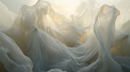 Soft, flowing layers of translucent fabric embrace a dreamy landscape, captured in gentle light, creating an abstract and serene atmosphere that invites wonder and reflection.