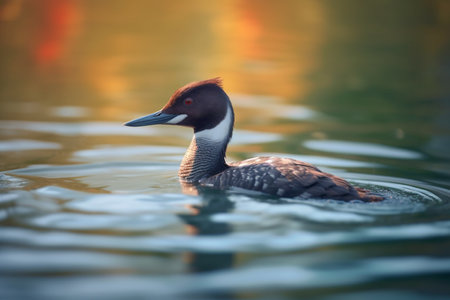 Common loon floating on a calm northern lake with vivid colorful reflection of the shoreline