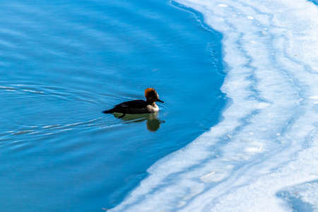 Red-breasted merganser chicks swimming in the water. The red-breasted merganser (Mergus serrator). natural habitat. wild conditions.