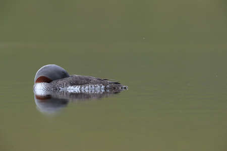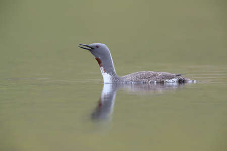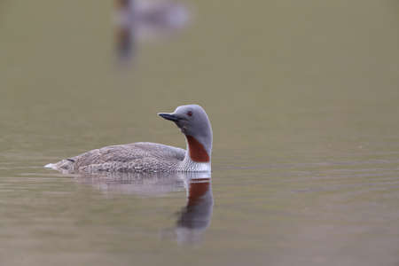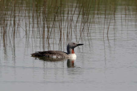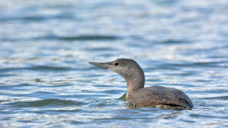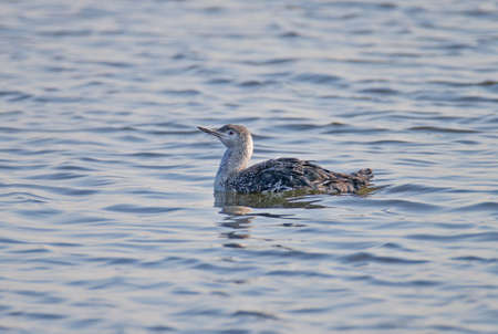 Close-up photo of a red-throated loon in winter plumage swims in the water of the estuary
