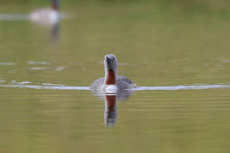 The waterfowl bird Great Crested Grebe swimming in the calm lake. The great crested grebe, Podiceps cristatus, is a member of the grebe family of water birds.