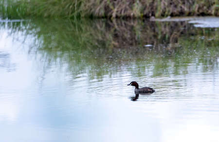 The black-necked grebe or eared grebe Podiceps nigricollis floats on the sunlit water surface, the best photo.