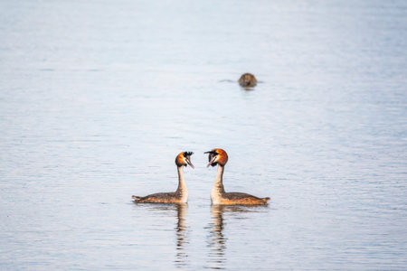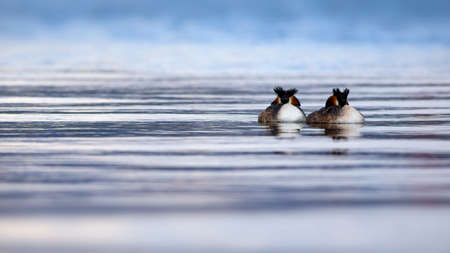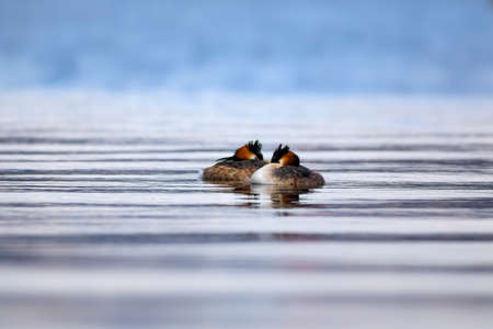 Mating games of two water birds Great Crested Grebes. Two waterfowl birds Great Crested Grebes swim in the lake. Great crested grebe, Podiceps cristatus, is a member of the grebe family of water birds