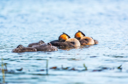 The waterfowl bird, great crested grebe with chick, swimming in the lake. The great crested grebe, Podiceps cristatus, is a member of the grebe family of water birds.