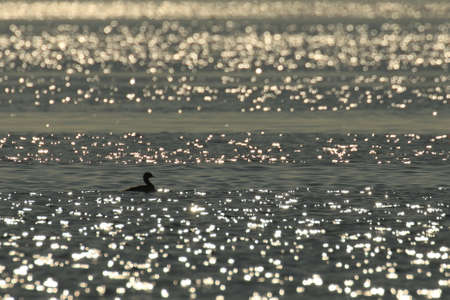 A silhouette side view of a Pied-billed Grebe (Podilymbus podiceps) swimming in water with sunlight sparkling on the waves. Taken in Victoria, British Columbia, Canada.