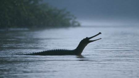 Gharial surfaces from the river to reveal its sharp snout silhouette, surrounded by a calm atmosphere and lush greenery along the riverbank at early morning.