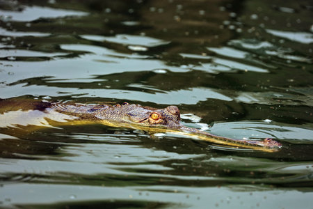 Crocodile swimming in the water. Gharial crocodile in Chitwan National Park, Nepal
