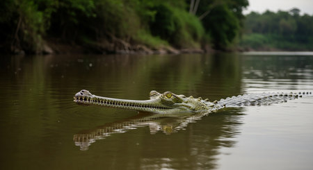 A gharial with a long narrow snout floats calmly in the serene water, surrounded by vibrant greenery. This iconic creature elegantly navigates its habitat, showing its unique features.