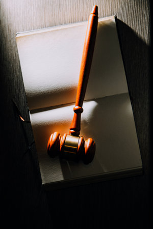 Brown wooden judges gavel on the table in close up. Wooden table, books. Space for text. Law and Justice theme