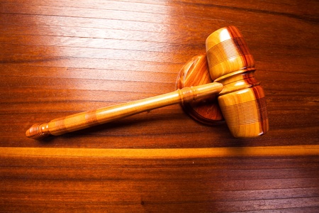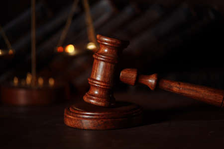 Law theme, mallet of the judge on wooden desk. Law gavel on dark foggy background with light. selective focus